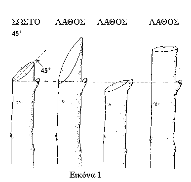 Ιδιαίτερη σημασία έχει ό τρόπος με τον οποίο γίνονται οι τομές του κλαδέματος . Η χρήση του σωστού εργαλείου , καλά συντηρημένου , με κοφτερές λεπίδες , έτσι ώστε να μην μασάει το προς κοπή κλαδί . Η τακτική απολύμανση των εργαλείων κλαδέματος , βοηθά στην αποφυγή της μετάδοσης μολυσματικών ασθενειών από φυτό σε φυτό . Οι τομές θα πρέπει να γίνονται με κλίση 45ο αντίθετα από τον τελευταίο οφθαλμό που διατηρούμε στο κλαδί (εικόνα 1) .