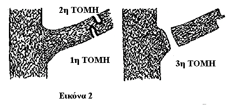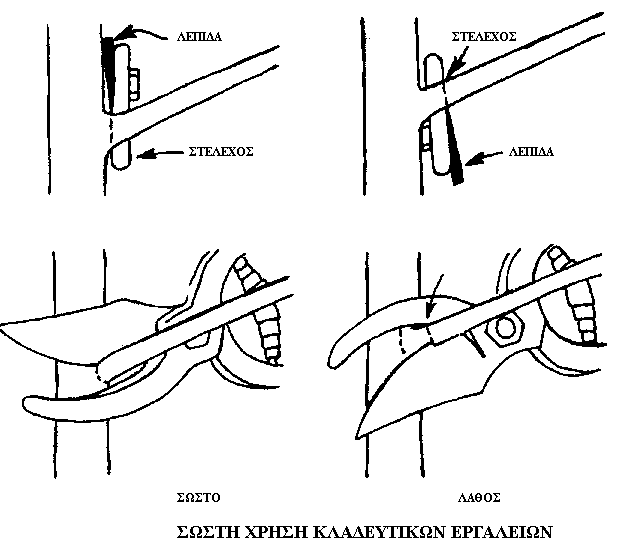 Προσοχή χρειάζεται κατά την κοπή μεγάλων και χοντρών κλαδιών (διαμέτρου πάνω από 3 cm) αφενός για να μην ξεμασκαλίζονται τα κλαδιά , αφετέρου για λόγους ασφάλειας (αποφυγή τραυματισμών) . Η τεχνική αυτή συνίσταται στην κοπή των κλαδιών σε τρία στάδια (εικόνα 2) . Η πρώτη τομή είναι ημιτελής και γίνεται στο κάτω μέρος του βλαστού , κοντύτερα στην βάση του , απ’ ότι η δεύτερη τομή που γίνεται πλησίον της πρώτης αλλά στο πάνω μέρος του βλαστού . Σε περίπτωση που επιβάλλεται να αφαιρεθεί ο βλαστός από την βάση του , προχωρούμε και στο τρίτο βήμα (εικόνα 2) , αφού πλέον το κλαδί έχει ελαφρύνει από το μεγάλο μέρος του φορτίου του .