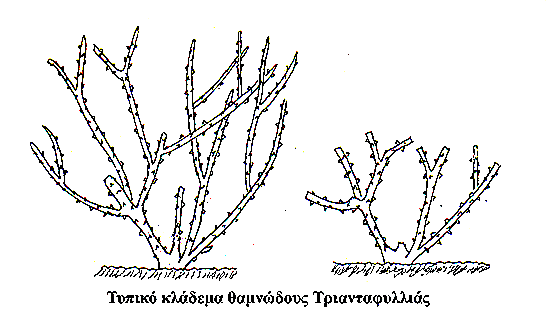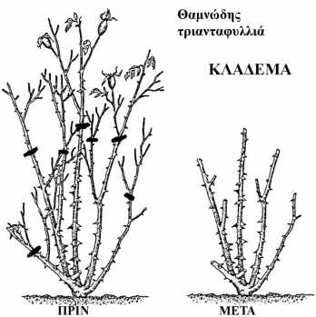 Ένα φυτό , για το οποίο υπάρχει έντονο κηποτεχνικό ενδιαφέρον για το κλάδεμά του , είναι η τριανταφυλλιά . Το βασικό κλάδεμα της τριανταφυλλιάς γίνεται κατά το τέλος του χειμώνα - αρχές της άνοιξης . Στην Αττική γίνεται συνήθως τον Ιανουάριο έως 15 Φεβρουαρίου . Σε ψυχρότερα κλίματα γίνεται λίγο αργότερα . Ένα δεύτερο ποιο ελαφρύ κλάδεμα γίνεται τέλος Ιουλίου - αρχές Αυγούστου για συμμάζεμα του σχήματος του φυτού και ώθηση σε νέα ανθοφορία το Φθινόπωρο . Οι κανόνες που ακολουθούμε στο κλάδεμά της θαμνώδους τριανταφυλλιάς είναι να αφαιρούμε όσα κλαδιά συγκλίνουν προς το κέντρο του θάμνου (καλός αερισμός) , τα γερασμένα , όσα παρουσιάζουν συμπτώματα προσβολών από παράσιτα (κοκκοειδή , κλπ) ή παρουσιάζουν εξελκώσεις και τραυματισμούς και όσα επίσης κλαδιά χαλούν το κανονικό σχήμα του φυτού . Σχηματικά το κλάδεμα της θαμνώδους τριανταφυλλιάς δίνεται από την παρακάτω σχετική εικόνα .